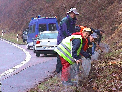 Kröten und Frösche wieder auf Wanderschaft (Foto:Richter)(hr) (ako) Bereits am letzten Samstag im März haben die beiden Eberbacher Umwelt- und Naturschutzverbände NABU und BUND wieder Amphibienschutzzäune im Ittertal aufgebaut. Aufgrund des langen Winters so spät wie noch nie, jedoch gerade noch rechtzeitig vor Beginn der Wanderung. Wenige Tage zuvor errichtete die Straßenmeisterei Neckarbischofsheim, Stützpunkt Eberbach, den Schutzzaun im Gammelsbachtal und montierte an allen drei Wanderstrecken Tempobegrenzungsschilder zum Schutz der Sammler.