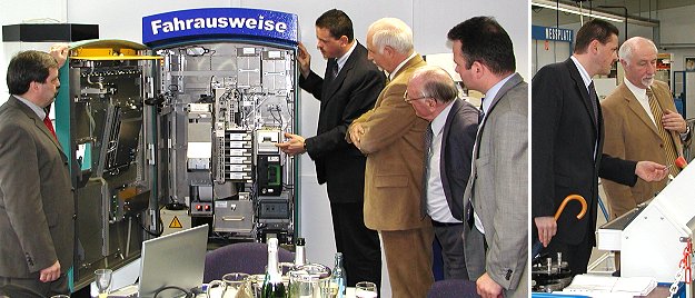 Dr. Jürgen Schütz informierte sich über Technologie Torsten Kappes zeigt das Innenleben eines Fahrscheinautomaten (v.l.: Dr. Bernd Teufel, Torsten Kappes, Dr. Jürgen Schütz, Seniorchef Otto Langkait und Bernhard Martin). In der Fertigung offenbarte der Landrat gezieltes Interesse (re.). (Fotos:Claussen)