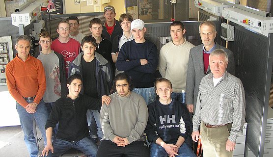 Im Foto zu sehen sind (von rechts nach links) Fachlehrer Walter Witter, Schulleiter Jörg Andresen, die derzeitigen Berufsfachschüler für Elektronik sowie ganz links Toni Dausch, der neue Leiter der gewerblichen Abteilung der TFS bei der Inbetriebnahme der neuen Werkstatt.