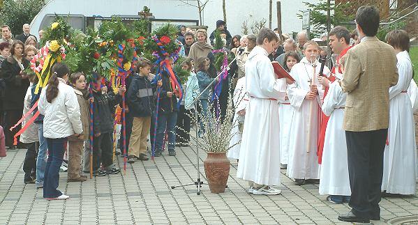 Palmweihe und Festgottesdienst mit den Kommunionkindern Palmweihe vor der Unterkirche von St. Josef. (Foto:Wörner)(tw) Heute feierten die Eberbacher katholischen Gemeinden St. Josef und St. Johannes Nepomuk in der Kirche St. Josef in Eberbach Nord den Palmsonntag. An diesem Tag gedenken die Katholiken alljährlich des Einzugs Jesu in Jerusalem wo er von den Menschen mit Palmzweigen begrüßt wurde. Traditionsgemäß trafen sich die Eberbacher Gemeinden vor der Unterkirche St. Josef wo Pfarrer Matthias Stößer "Palmstecken", "Palmsträußchen" und Zweige weihte. Diese waren am Samstag von den Eberbacher Kommunionkindern unter Anleitung von Frauen der Gemeinde St. Josef in der Unterkirche gebunden worden.