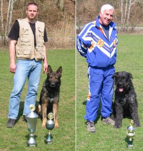 Erste Prüfung nach der Winterpause bei der Ortsgruppe Eberbach Christian Sauer mit "Kejko von Karthago" bei der Siegerehrung (li.),"Hootsch Zielebacher Hof“ und Stefan Urban gewannen den Pokal für die beste Fährtenarbeit (r.). (Fotos:privat)(jc) (cp) Am vergangenen Wochenende führten die Eberbacher Hundesportler auf ihrem Vereinsgelände an der Itter eine Ortsgruppen-Prüfung durch. 13 Hundeführer stellten sich mit ihren Vierbeinern der Be-wertung des Richters Franz Dörr.