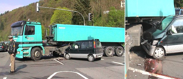 Rote Ampel übersehen (Fotos:Richter)(hr) Erhebliche Verletzungen zog sich ein 56-jähriger Autofahrer aus der Schweiz heute Vormittag bei einem Unfall auf der Bundesstraße 37 in Eberbach zu. Gegen 9.30 Uhr war er in Richtung Heidelberg unterwegs, als er an der Einmündung der Hirschhorner Landstraße offenbar die rote Ampel übersah. Der Daihatsu Mini-Van des Schweizers prallte gegen einen Sattelzug aus dem Neckar-Odenwald-Kreis, der ordnungsgemäß aus der Hirschhorner Landstraße nach links in die B 37 einbiegen wollte.