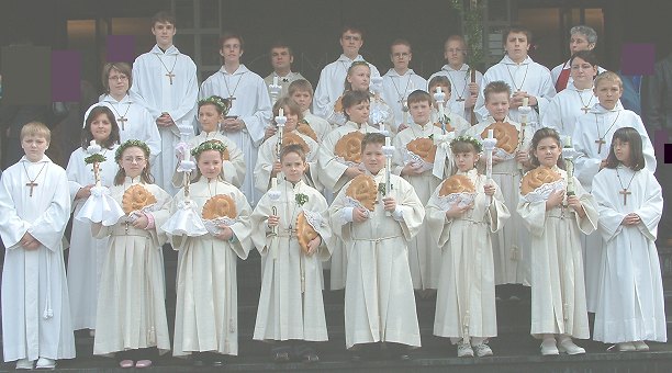 Feier der Erstkommunion in der Kirche St. Josef Die Kommunionkinder mit Pfarrer Matthias Stößer, den Ministranten und Pastoralreferentin Sabine Bohnert nach dem Festgottesdienst in St. Josef. (Foto:Wörner)(tw) Heute war für 14 Kinder aus Eberbach Nord, aus Friedrichsdorf, aus Rockenau und aus Pleutersbach "Weißer Sonntag". Während eines Festgottesdienstes mit Pfarrer Matthias Stößer in der voll besetzen Kirche St. Josef empfingen sie erstmals das Sakrament der heiligen Kommunion. Der feierliche Einzug in die Kirche und Auszug erfolgte unter den Klängen der Katholischen Pfarrkapelle unter der Leitung von Alois Hock. Der musikalische Rahmen des Gottesdienstes wurde vom Singkreis der KJG unter der Leitung von Bezirkskantor Godehard Weithoff gestaltet. Pastoralreferentin Sabine Bohnert bedankte sich bei Pfarrer Matthias Stößer, allen Eltern und Gemeindemitgliedern, welche die Kommunionkinder in diesem Jahr auf ihrem Kommunionweg begleiteten und noch weiterhin begleiten. Frau Bohnert konnte ihrerseits den Dank von Pfarrer Stößer für die Leitung der umfangreichen Vorbereitungen zur "Ersten heiligen Kommunion" in Eberbach entgegennehmen. Ein Teil der Eberbacher Kommunionkinder hatte bereits am vergangenen Sonntag in der Stadtkirche die Erstkommunion gefeiert (wir berichteten).