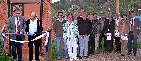 Die Tennisanlage wurde um eine Beregnungsanlage bereichert Links: Der 1. Vorsitzender Rolf Schieck und Antonio Ragucci geben die Tennisanlage mit Beregnungsanlage frei (v.l.), rechts: Dr. Jochen Schmitt, Christel Hepp, Bernd Hauck, Paul Sillak, Beppo Lemberger, Peppi Veith, Thomas Schlachter, Herrmann Volk, Gertraude und Kurt Messing, Heike Menges und Rolf Schieck (v.l.).(bro) (js) Eine große Schar von Mitgliedern war am vergangenen Freitag in die Au gekommen, um zusammen mit dem Vorstand die Tennissaison 2006 zu eröffnen. Dabei wurden nicht nur die Tennisplätze für den Spielbetrieb freigegeben, sondern mit der Einweihung einer neuen Beregnungsanlage konnte ein lange gehegter Wunsch aller aktiven Mitglieder erfüllt werden. Ab sofort fällt das umständliche Spritzen der Plätze vor und nach dem Spielen bei trockener Witterung weg. Für jeden der neun Plätze muss nur noch ein Hebel umgelegt werden, so wie es der erste Vorsitzende Rolf Schieck erfreut demonstrieren konnte, nachdem er zusammen mit Antonio Ragucci, der die Erdarbeiten ausgeführt hatte, ein Band zur symbolischen Freigabe durchschnitten hatte. Aber nicht nur die neue Beregnungsanlage konnte den Mitgliedern übergeben werden, sondern auch ein wiedereröffnetes Clubhaus "Balaton" mit neuen Türen und Fenstern und einem neuen ungarischen Pächterehepaar. Rolf Schieck bedankte sich bei all den Mitgliedern, die in diesem Jahr mehr als in der Vergangenheit durch freiwilligen Arbeitseinsatz dazu beigetragen hatten, dass trotz langem Winter und schlechter Witterung die Anlage noch rechtzeitig vor Spielbeginn geöffnet werden konnte. Sein besonderer Dank galt dabei vor allem drei Mitgliedern, die nicht nur viele Stunden abgeleistet hatten, sondern auch für die Planung und Organisation zuständig waren: Herrmann Volk, Peppi Veith und Thomas Schlachter. Für die umfangreichen handwerklichen Arbeiten dankte der 1. Vorsitzende den Firmen FSK, Rebscher, Faul und Ragucci und deren Mitarbeitern. Anschließend ehrte der 2. Vorsitzende, Dr. Jochen Schmitt, folgende Mitglieder für 25-jährige Mitgliedschaft: Heike Menges, Bernd Hauck sowie Gertraude und Kurt Messing. Als Dank für mehr als 30 Jahre Platzwarttätigkeit durfte Beppo Lemberger einen großen Geschenkkorb entgegennehmen. Nach dem offiziellen Teil begann der gemütliche Abend, der von der neuen Pächterfamilie Vamos mit kulinarischen Köstlichkeiten aus Ungarn bestens vorbereitet war.