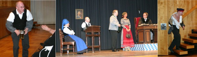 Das siebenköpfige Ensemble verstand es dann, das Publikum im Saal zum Schmunzeln und Lachen zu bringen. Gleich zu Beginn wurde es vom Gerichtsdiener Vitus Pfingstl mit den Regeln des Königlich Bayerischen Amtsgerichts bekannt gemacht. Während er sich mittels einer zünftigen Maß Bier auf die schwierigen Verhandlungen vorbereitete, machte er das Publikum zu dem, was es ja schon war, nämlich zum Publikum – zum Gerichtspublikum. Und dem obliegen – wie der geübte Gerichtsshowgucker bereits weiß – Pflichten. Die wichtigste ist neben der Ruhe während der Verhandlung das Aufstehen beim Erscheinen des Gerichts und bei der Urteilsverkündung. Nach mehrmaligem Üben war Pfingstl zufrieden und hielt das Publikum des Erscheinens des Oberamtsrichters für würdig.
