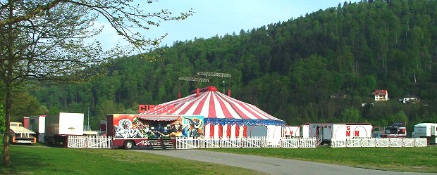 Zirkusluft in Eberbach (Foto:Richter)(hr) Auf dem Festplatz in der Au hat der "Circus Baronn" seine Zelte aufgeschlagen. Bis Sonntag, 7. Mai, gastiert er in Eberbach. Vorstellungen sind heute um 15 und 19 Uhr, am morgigen Samstag ebenfalls um 15 und 19 Uhr sowie am Sonntag um 15 Uhr.