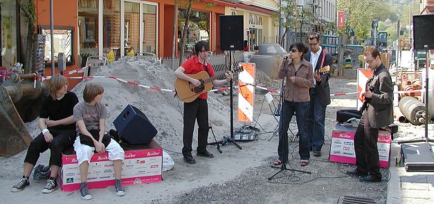 Eberbacher Band unterstützte Weltrekordversuch (Foto:Claussen)(jc) Die Bundesvereinigung Deutscher Musikverbände e.V. und die Drogeriemarktkette dm hatte für den vergangenen Samstag zu einem Weltrekordversuch aufgerufen (wir berichteten). In Hunderten Städten und Gemeinden sollte am Vormittag die Stärke der Musik demonstriert werden. Mehr als 100 Orchester sollten gleichzeitig vor dm-Märkten im ganzen Bundesgebiet auftreten und so die Aktion "ZukunftsMusiker" bekannt machen. In Eberbach unterstützte die Band "Unintended" die Aktion. Mitten auf der Baustelle in der Friedrichstraße hatte sich "Unintended" platziert und sorgte bei herrlichem Frühlingswetter vor dem Drogeriemarkt für ausgezeichnete, für viele Passanten unerwartete aber willkommenen Unterhaltung. Die Zusammenarbeit mit den dm-Märkten ist die zweite erfolgreiche Kooperation im Rahmen von "WIR! 2006". Bereits zum 27. Januar waren die BDMV-Mitglieder dazu aufgerufen, anlässlich der Feierlichkeiten zum 250. Geburtstag von Wolfgang Amadeus Mozart Grundschulen zu besuchen und Kinder für die Musik und das Musizieren zu begeistern.