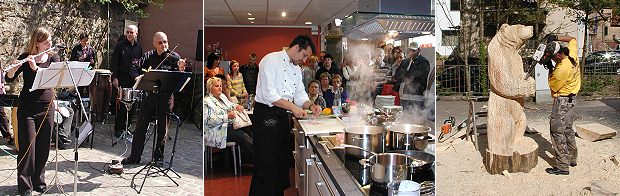 Gewerbetag mit verkaufsoffenem Sonntag in Hirschhorn (Fotos:Claussen)(jc) Unter der Leitung der Gewerbetreibenden präsentierten sich heute viele Betriebe, Vereine und Organisationen in Hirschhorn. Mit einem Rahmenprogramm aus Bereichen des kulturellen und gesellschaftlichen Lebens war gute Unterhaltung angesagt. Rundfahrten mit dem Feuerwehrauto für die Kleinen und Vorführungen in der Kochwerktatt oder ein Bierchen in der Sonne nach dem Einkauf für die Erwachsenen, für jeden war etwas geboten. Auch städtische Einrichtungen wirkten mit. Bauhof, Touristinfo, Feuerwehr sowie zahlreiche Betriebe waren geöffnet und boten Einblicke in verschiedene Arbeitssituationen. Die Kindertagesstätte Hirschhorn war mit Spiel und Spaß für Kinder im Bürgerhaus am Start, auf dem Chateau-Landon-Platz war ein großer Flohmarkt aufgebaut.