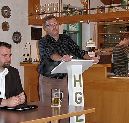 Vorstände bestätigt - Formelle Änderungen in der Vereinssatzung Joachim Kaschper bei seiner Begrüßung im Vereinsheim. (Foto:Claussen)(jc) Ein knappes Jahr nach seiner Wahl zum HGE-Vorsitzenden blickte Joachim Kaschper gestern bei seiner ersten Generalversammlung auf ein Jahr mit einigen Problemen, aber auch mit vielen positiven Dingen zurück. Seine selbst gesteckten Ziele habe der neue Vorstand nur teilweise erreichen können. So habe man einen geplanten Förderverein nicht realisieren können. Man wolle nun mit einem Förderbeitrag ein neues Konzept umsetzen. Ebenso sei es nicht gelungen das Vereinsheim besser in den Mittelpunkt des Vereinslebens zu stellen. Zum Abschluss seiner kurzen Ansprache bedankte sich Kaschper bei allen Trainern, Betreuern und Helfern.