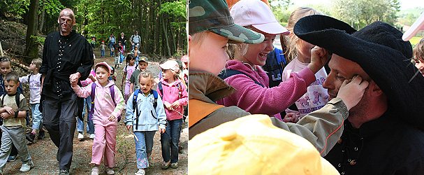 Ein spannender Vormittag in den Wäldern rund um Mülben (Fotos: privat)(bro) (hk) Unter der Leitung von Fritz Kaufmann vom Naturpark Neckartal-Odenwald erlebten 21 Schulanfängerkinder des evangelischen Kindergartens ARCHE NOAH einen spannenden Vormittag in den Wäldern rund um Mülben. Sie machten sich gemeinsam zu Fuß auf die Spuren des Räuberhauptmanns Hölzerlips, der Anfang des 19.Jahrhunderts dort und in der Umgegend sein Unwesen trieb. Schon zu Beginn zog Fritz Kaufmann seine kleinen Zuhörer in seinen Bann. Die Kinder durften ihn als Räuber verkleiden und mit echtem Ruß das Gesicht schwärzen. Sie erfuhren, dass der Räuberhauptmann Hölzerlips mit bürgerlichem Namen Georg Phillip Lang hieß und einen ganz normalen Beruf ausübte, nämlich den Handel mit Holz, hölzernen Waren und Baumpilzen, weswegen er Hölzerlips genannt wurde. Höhepunkt des Ausflugs war das Picknick rund um das Felsenhaus, einer Ansammlung von Buntsteinfelsen, das Hölzerlips und seiner Bande in der Zeit zwischen 1800 und 1812 als Schlupfwinkel diente. In der kleinen Höhle dort erzählte Fritz Kaufmann den äußerst interessierten Kindern von der besonderen Geheimsprache, in der sich die Räuber verständigten und dem besonderen Erkennungszeichen untereinander. Vorbei an den Resten verfallener Häuser von Unterferdinandsdorf wanderte die Gruppe weiter bis zum Reisenbacher Grund, von wo aus sie die Rückreise zum Kindergarten antrat.