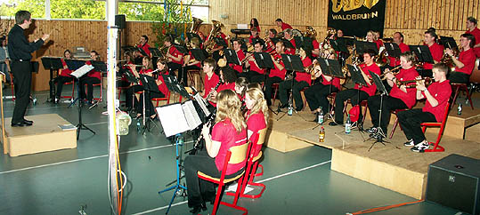 Mit einem Stück von Harold Faltermeyer, der als erster deutscher Popkünstler mit einem Grammy ausgezeichnet wurde startete dann das Jugendblasorchester sein Programm. Sie hatten sich hierzu das Stück "Axel F", die Titelmelodie zum Film Beverly Hills Cop ausgesucht. Mit "Latin America" folgte dann eine moderne Suite von Manfred Schneider. Der erste Satz, "Acapulco", stellte das mondäne Seebad voller Heiterkeit dar. Nach der getragenen Überleitung, welche die Weite des Landes symbolisieren soll, folgte ein temperamentvolles Marcia-Thema, als Interpretation eines Feuerwerkes. Den ersten Satz beschloss ein "Mexican Waltz", der das unbeschwerte Leben in dieser Stadt demonstrieren sollte. Der zweite Satz, "Maccu Picchu" erzählte musikalisch geheimnisvoll von der einstigen Größee, Kultur und Untergang des einstigen Reiches der Inka. Mystisch erklang hierbei die tragende Melodie von "El Condor Pasa", gefühlsvoll intoniert durch die Flötistinnen des Jugendblasorchesters Waldbrunn. Im dritten Satz wurde "Sao Paulo", eine verschlafene Stadt im Innern von Brasilien, deren Bewohner ein karges Dasein führen, musikalisch skizziert. Nur einmal im Jahr kommen sie zum "Fest des Condors" zusammen. Eine feurige Samba erklingt, es folgt eine Beguine und mit der Wiederholung des Samba-Themas endet das Fest. Gut aufgelegt zeigte sich dabei die Percussionsgruppe des Orchesters. Mit dem "Egerländer Liedermarsch", arrangiert von Norbert Studnitzky, verabschiedete sich das Jugendblasorchester Waldbrunn in die Pause. Nach der Pause begann man dann mit dem "Clog Dance". Danach entführte das Orchester die Besucher mit der "Samba Time" von Manfred Schneider nach Südamerika. Hierbei kam richtige Stimmung bei heißen Samba-Rhythmen auf. Gefordert war da auch wieder die Percussionsgruppe, die sich mächtig ins Zeug legte und einen prima Rhythmus vorlegte. Viel Beifall gab es auch für dieses Stück. Als nächstes brachte das Orchester das Stück "Air for Winds" als Arrangement von Andre Waignein zu Gehör. Einen gelungenen musikalischen Ausflug in die Rockmusik machten dann die jungen Musikerinnen und Musiker mit dem Stück "Africa" der Rockband Toto. Passend hierzu hatte man sich mit E-Gitarre, E-Bass und Keyboard verstärkt, die aber auch außer der E-Gitarre das Blasorchester während des gesamten Konzertes begleiteten. Den Schlusspunkt setzte das Orchester dann mit dem Stück "Hawaii 50". Tobender Applaus und stehende Ovationen der begeisterten Konzertbesucher entlockten dem Orchester dann noch drei Zugaben. Zuerst brachte man die Sehnsuchtsmelodie, bei der der musikalische Leiter des Orchesters, Peter Schäfer, selbst zur Trompete griff. Als zweite Zugabe brachte man "Happy Luxemburg" von James Last zu Gehör. Als absoluten Schlusspunkt spielte das Jugendblasorchester dann noch einmal "Africa" der Rockband Toto. Mit weiterem reichlich Beifall ging dann das diesjährige Frühjahrskonzert des Jugendblasorchesters Waldbrunn zu Ende, bei dem es wieder sein ganzes musikalisches Können aufrufen konnte und Werbung für sich und moderne Blasmusik machen konnte.