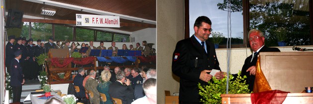 Die Freiwillige Feuerwehr in Allemühl wird 50 Jahre alt. In seiner Festansprache berichte Abteilungskommandant Friedbert Heiß aus der von Stadtarchivar Dr. Rüdiger Lenz recherchierten Feuerlöschchronik des Allemühler Tals. So war zu erfahren, dass es in Allemühl schon seit weit mehr als 50 Jahren Feuerlöschverbände gab. Bereits im 19. Jahrhundert bildeten die benachbarten Gemeinden Schönbrunn, Neunkirchen, Moosbrunn und Haag einen Feuerspritzenverband, von dem Ober- und Unterallemühl allerdings ausgeklammert waren. Beide Orte waren damals noch unselbstständige Teile anderer Gemeinden. Unterallemühl gehörte zu Schwanheim, Oberallemühl zu Schönbrunn.