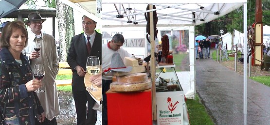 Erlebnisworld startet als Waterworld Landtagsabgeordnete Elke Brunnemer, Bürgermeister Bernhard Martin und Ausstellungsmacher Helmut Niesner (v.l.) ließen sich beim Messerundgang ein Glas Wein schmecken. Den dazu passenden Käse gibt es dort ebenso zu kaufen wie viele andere Lifestyle-Accessoires. (Fotos:Richter)(hr) Bei strömendem Dauerregen feierte die Lifestyle-Ausstellung "Erlebnisworld" heute Nachmittag in der Grünanlage zwischen Stadthalle und Uferstraße eine feucht-fröhliche Premiere. Bürgermeister Bernhard Martin begrüßte zur Ausstellungseröffnung als Schirmherr im trockenen Stadthallen-Foyer den Organisator Helmut Niesner, die Landtagsabgeordnete Elke Brunnemer, Schönbrunns Bürgermeister Roland Schilling und mehrere Stadträte. Mit dabei war auch Claude Richard aus Eberbachs französischer Partnerstadt Thonon-les-Bains.