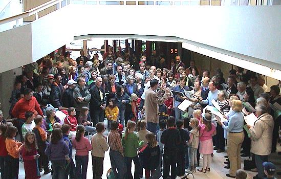 Frühlingslieder erklangen in der Stadthalle (Foto:Richter)(hr) Das gab es noch nie: In der langen Geschichte des Eberbacher Frühlingsfestes musste die traditionelle Eröffnung mit dem Frühlingsliedersingen heute um 18.30 Uhr erstmals in geschlossenen Räumen stattfinden. Wegen des anhaltenden Regens entschlossen sich die Organisatoren spontan zur Verlegung der auf dem Alten Markt geplanten Eröffnungszeremonie ins Foyer der Stadthalle.