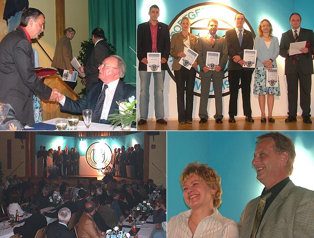 Ehrungen, Lob und Respekt für einen Traditionsverein Links oben: Hermann Eiermann erhält von Wolfgang Wäsch für 50 Jahre Mitgliedschaft die Goldene Ehrennadel. Rechts oben die für 25 Jahre Mitgliedschaft Geehrten Torben Menges, Kerstin Rundel, Tobias Menges, Alexander Silbereis und Jutta Veith-Neuer mit dem stellvertretenden Vorsitzenden Torsten Leuwer (v.l.). Rechts unten Heike und Thomas Achilles, die mit der Goldenen Ehrennadel ausgezeichnet wurden. (Fotos:Menges/Richter)(hr) (cum) 75 Jahre SG Rockenau feierte der Fußballverein am Freitagabend in der Rockenauer Festhalle mit einem Festbankett. Mit zwei Multimediashows, kurzweiligen Reden und Ehrungen ließ der Traditionsclub seine ereignisreiche Geschichte Revue passieren.