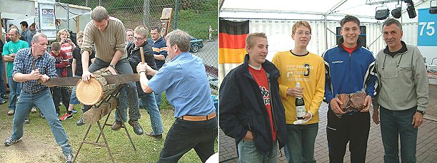 Jubiläumssportfest stand ganz im Zeichen der Dorfolympiade Der "Stammholzsägewettbewerb" bei der Olympiade heute Nachmittag in Rockenau und SG Vorstand Wolfgang Wäsch mit Vertretern der Mannschaft "Nord" bei der Siegerehrung am Abend. (Fotos:Wörner)(tw) Mit Torwandschießen für Frauen, einem Wasserlauf mit Hindernissen der von den Kindern bestritten wurde, mit Stammholzsägen und einem Elfmeterschießen gegen Torsten Leuwer wurde heute Nachmittag bei strahlendem Sonnenschein die vierte Rockenauer Dorfolympiade ausgetragen. Mit Spaß, Elan und Ehrgeiz kämpften die Mannschaften im fairen Wettstreit gegeneinander, jeweils angefeuert von den zugehörigen Fans. Sieger wurde am Ende mit knappem Vorsprung die Mannschaft "Rockenau Nord" (13 Punkte), gefolgt von "im Teich" (12), "im Rot" (9) und "Rockenau Süd-Mitte" (8).