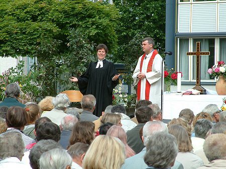 Gemeinsame Pfingstbotschaft Dekanin Hiltrud Schneider-Cimbal und Pfarrer Mathias Stößer bei der Gottesdienstfeier auf dem Leopoldsplatz. (Foto:Wörner)(tw) Bereits das siebte Mal begingen heute die evangelischen und katholischen Gemeinden Eberbachs das Pfingstfest mit einer gemeinsamen Feier. Dekanin Hiltrud Schneider- Cimbal und Pfarrer Mathias Stößer feierten bei herrlichem Sonnenschein am Vormittag zusammen mit zahlreichen Gläubigen einen ökumenischen Gottesdienst. Musikalisch umrahmt wurde die Feier in der wunderbaren Kulisse auf dem Leopoldsplatz von den Klängen des evangelischen Posaunenchors. Die gesammelte Kollekte soll je zur Hälfte der ökumenischen Arbeit in Eberbach und den neuerlichen Erdbebenopfern in Südostasien zugute kommen.