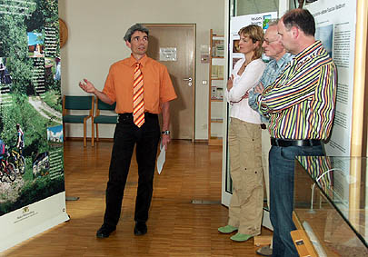 Naturpark-Ausstellung eröffnet "Naturparke sind Landschaften voller Leben" heißt das Motto einer Wanderausstellung die gestern im Waldbrunner Rathaus eröffnet wurde. Dabei erläutete der Geschäftsführer des Naturparks Neckartal-Odenwald, Manfred Robens (l.), die einzelnen Schautafeln. (Foto: Baumgartner)(tb) Zum ersten Mal im Neckar-Odenwald-Kreis ist dieser Tage die Wanderausstellung "Naturparke sind Landschaften voller Leben" in Waldbrunn zu sehen. Bei der Ausstellungseröffnung im Waldbrunner Rathaus begrüßte Bürgermeister Klaus Schölch die erschienenen Gäste, allen voran Manfred Robens, Geschäftsführer des Naturparks Neckartal-Odenwald. Schölch betonte in seiner Begrüßung, dass es auch dem Geschäftsführer des Naturparks ein Anliegen sei, die Ausstellung auch in Waldbrunn zu präsentieren. Mit dem Katzenbuckel als höchster Punkt des Odenwaldes und Fundort des Trematosaurus sei Waldbrunn dafür prädestiniert. Zugleich stellte Schölch die Gemeinde Waldbrunn vor, deren Gemarkung über 55 ha Wald umfasse und sich dabei für Wanderungen anbiete. Gerade das Thema Wald werde hier großgeschrieben. Man habe Waldsportpfade, Waldlehrpfade, aber natürlich auch den Weg der Kristalle am Katzenbuckel, sowie in absehbarer Zeit eine Nordic-Walking- und Lang-Laufstrecke. Der Waldbrunner Bürgermeister zeigte sich erfreut, dass die Ausstellung hier gezeigt werden kann und sagte dabei auch, dass Planungen für ein Museum im Gange seien. Dieses sei aber in dieser finanziell schwierigen Zeit schwer zu realisieren. Für das Museum sei aber schon eine Gesteinssammlung angeboten worden, die für die Gemeinde keine Kosten verursachen würde. Man denke daran, diese Sammlung im Rathaus zu lagern und zu zeigen, um sie später dann dem Museum zuzuführen.