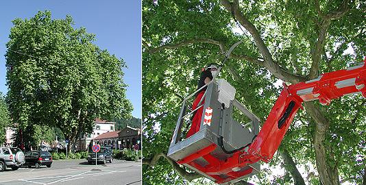 Fachfirma dämmt Pilzinfektion ein (Fotos:stve)(hr) (stve) Die große Platane auf dem Bahnhofsplatz bereitet zunehmend Sorge. Aufgrund ihres neuralgischen Standorts an einem der verkehrsreichsten Bereiche im Stadtgebiet hat man schon lange ein besonderes Augenmerk auf den beeindruckenden Baum gerichtet. So wird die mächtige Platane seit 15 Jahren regelmäßig überprüft, und zum Schutz der Fußgänger und parkender Autos hatte man 1997 eine Kronensicherung mittels 15 Hohlflechtseilen eingezogen.