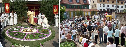 Lange Prozession bei schönstem Wetter Aufwändig gelegte Blumenornamente und ein riesiger Blumenteppich schmückten die vier Altäre und die Straße entlang des fast 800 Meter langen Prozessionsweges bei der heutigen Fronleichnamsprozession in Strümpfelbrunn. An vier Stationen hatte man Altäre aufgebaut, wo man für alle Menschen betete. Unsere Fotos zeigen Stationen der Prozession. (Fotos: Baumgartner)(tb) Heute wurde in vielen Bundesländern das erstmals im Jahre 1264 von Papst Urban IV. eingeführt Fronleichnamsfest begangen. Der Begriff Fronleichnam stammt eigentlich vom mittelhochdeutschen "vronlicham" ab, was soviel wie der Leib des Herrn des Herrn bedeutet. Die römisch-katholische Kirche feiert dieses Fest, in welchem die Gegenwart Christi im Sakrament der Eucharistie gegenwärtig ist, am Donnerstag nach Trinitatis, der seinerseits vom Osterdatum abhängig ist. Auch in Waldbrunn beging die kath. Kirchengemeinde St. Maria dieses Hochfest mit der traditionellen Sakramentsprozession. Während in vielen Orten keine Blumenteppiche mehr, bzw. nur wenige Bilder gelegt werden, so hält man in Waldbrunn an dieser langen Tradition fest und so ging der Prozessionsweg entlang der kunstvoll gestalteten Blumenteppiche, die Gäste aus der ganzen Umgebung nach Strümpfelbrunn führen. Schon morgens ab 5 Uhr waren viele fleißige Helferinnen und Helfer, darunter auch Kinder und Jugendliche mit dem Legen der Blumenteppiche und dem Schmücken der Altäre beschäftigt. Zum Schon am Tag zuvor sammelten viele fleißige Helfer Blumen, Blüten und Blätter für den auch in diesem Jahr wieder rund 800 Meter langen Blumenteppich durch die Straßen von Strümpfelbrunn. Sehr viel Glück hatte man in diesem Jahr auch wieder mit dem Wetter, da strahlendes Sommerwetter den Waldbrunner Katholiken beschieden war. Auch wurde der Gottesdienst und anschließende sehr große Prozession in diesem Jahr wieder von sehr vielen Gläubigen besuchte. Nach dem von Pater Kasimir Fieden und Diakon Bisanz aus Mannheim zelebrierten Hochamt führte die Prozession die Gläubigen entlang der alten Marktstraße zur Kreuzung Richtung Waldkatzenbach, wo der erste Altar beim Gardinengeschäft Bier aufgebaut war. Nach diesem Altar dessen aufwändige Blumenornamente die sieben Sakramente symbolisierten, führte der Prozessionsweg dann weiter über die Waldkatzenbacher Straße zur Siedlerstraße, wo der nächste Altar stand. Traditionsgemäß wird dieser Bereich von der Jugend gestaltet für die man auch dort betete. Über die Gartenstraße gelangten die Gläubigen dann den dritten Altar, welcher am Edeka-Markt Brummer aufgebaut worden war. Hier betete man für die Alten und Kranken, Gläubigen aller Religionen aber auch die Verwaltung der Gemeinde, die vielen Gästen, die Polizei und die Feuerwehren. An der letzten Station bei der Kirche bedankte sich Pater Kasimir Fieden bei allen freiwilligen Helfern, die beim Legen der kunstvollen Blumenteppiche mitgewirkt haben.