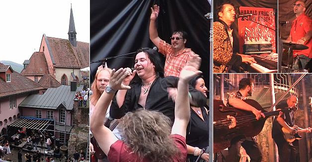 Drei Generationen rockten gemeinsam Rockfestival in historischen Mauern: "Bubble Chamber" (Mitte) und "Low Budget" sorgten für Stimmung im Hof des Karmeliter-Klosters. (Fotos:Richter)(hr) Vor allem die Oldie-Fans kamen gestern beim Hirschhorner "Rock im Klosterhof" auf ihre Kosten. Die Veranstalter von der Katholischen Kirchenmusik (KKM) hatten zwei starke Party-Bands engagiert: "Bubble Chamber" mit dem gebürtigen Hirschhorner Achim Emmert an den Keyboards hatte sich dem rockigen Sound der 80er Jahre verschrieben und brachte die großen Hardrock-Hits von Van Halen, Bon Jovi oder AC/DC ebenso druckvoll rüber wie die poppigeren Stücke von Nena, Katrina & The Waves oder Simple Minds. Am Ende ihres Auftritts brodelte im Publikum vor der Bühne die Stimmung.