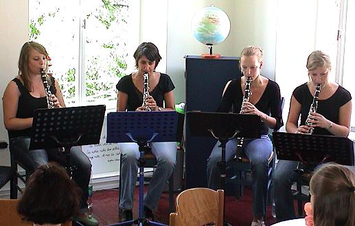 Ein Ständchen zum 250. Geburtstag Mozarts (Foto:Richter)(hr) Passend zum Mozartjahr 2006 - der große Komponist wurde vor 250 Jahren geboren - lud die Buchhandlung Greif in Eberbach gestern zu einer Matinee mit dem Weinheimer Klarinettenensemble "36 Finger" ein. Magdalena Wilhelm, Nassim Alizadeh, Julia Huk und Antonia Brandi spielten Kammermusik von Mozart und boten auch einen Querschnitt durch die Oper "Die Zauberflöte". Von CD eingespielt wurden Mozartbriefe, gelesen von Klaus Maria Brandauer.