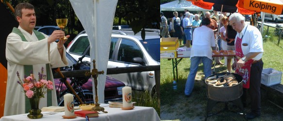 Kolpingsfamilie und Gäste kamen ins Schwitzen (Fotos: privat)(bro) (wh) Bereits zum 31. Mal lud die Kolpingsfamilie Eberbach am Sonntag, 18. Juni, zu ihrem Familientag ein. Während der Feldmesse auf dem Jugendzeltplatz im Ittertal, die von der katholischen Pfarrkapelle gestaltet wurde, ging Pfarrer Mathias Stößer auf die Lesung aus dem Buch Ezechiel: 17, 22-24 näher ein. Er nahm dabei Bezug auf die Fronleichnamsprozession und brachte zum Ausdruck, dass Gott die Welt liebt. Pfarrer Stößer machte dies an Bespielen in der Natur deutlich. Für die jüngsten Mitchristen fand wieder eine Kinderkirche statt, welche vom Familienkreis gestaltet wurde. Anschließend hatten die Helfer der Kolpingsfamilie bei Temperaturen bis zu 30 Grad alle Hände voll zu tun. Rund 100 Familien mit ihren Kindern wollten mit kühlen Getränken, Erbsensuppe, Bratwurst sowie mit Kaffee und Kuchen versorgt werden. Abkühlung brachte für Jung und Alt die Itter. Der Reinerlös ist für soziale Belange bestimmt.