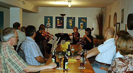 Viel Beifall für Eberbacher Musikschul-Ensembles (Foto: privat)(bro) (rau) Am vergangenen Mittwoch musizierten zwei Ensembles der Musikschule Eberbach in der Herzog-Wilhelm-Stube der Beerfeldener Brauerei. Sowohl für ein Streichquartett als auch die Swingcombo "The Gipsies" gab es viel Beifall. Wenn sich Schüler Streichquartette von Mozart oder gar Borodin vornehmen, wird es spannend, geht es doch nicht um irgendwelche Übungsstückchen. Lehrer Vladimir Rivkin hörte ganz genau hin, als seine Eleven Frederik Schmidt, Alexander Schindler (Violinen), Gesa Stupperich (Viola) und Konrad Heimpel (Violoncello) Mozarts D-Dur-Quartett, KV 575 interpretierten. Ohne Dirigent, nur mit Augenkontakt und Emphase, galt es, den Saiten ein Gemeinschaftswerk zu entlocken. Dabei gelang es dem Quartett bei einem runden, schon relativ sicheren Bogenstrich durchaus, dem Werk Konturen zu verleihen. Schön ausgestaltete Kantilenen, rhythmische Impulse, häufig angeführt vom Cello, respektable Unisoni und flüssige Tempoübergänge waren die Früchte einer gewiss harten Probenarbeit. Noch zupackender und klangvoller kamen die Auszüge aus Alexander Borodins zweitem Streichquartett daher. Die üppig strömende russische Melodik schien die Jugendlichen emotional zu packen. Das Publikum ging begeistert mit und geizte nicht mit Szenenapplaus nach jedem Satz.