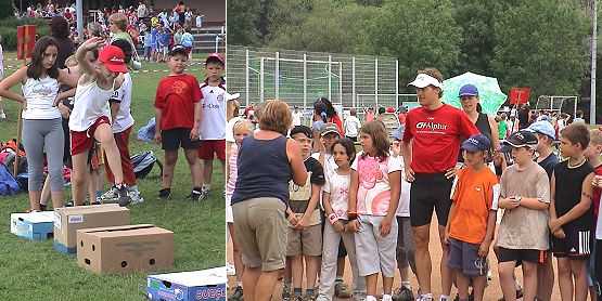 Schulkinder liefen für Internet-PCs Links eine Szene vom Spiel- und Sportfest, rechts die jungen Leichtathleten mit Spitzensportler Timo Bracht. (Fotos:C.Richter)(cr) Für die Schülerinnen und Schüler der Dr.-Weiß-Grundschule fand der Unterricht heute einmal nicht in den Klassenräumen statt. Konrektorin Claudia Schicht hat zusammen mit dem Schulleitungsteam Justina Lechtenfeld, Eva Schmitt und Iris Frenzl seit etwa einem halben Jahr geplant und organisiert, damit heute ein Sponsorenlauf mit Spiel- und Sportfest für die 320 Schulkinder in der Au stattfinden konnte. 20 beziehungsweise 25 Minuten lang durften die Schülerinnen und Schüler auf der Aschenbahn rennen, laufen und gehen. Begleitet und angespornt wurden sie von der in Eberbach bekannten Läuferin Cornelia Nuding, die selbst ein Kind in der 1. Klasse hat. Neben dem Spaß, den die Kinder hatten, haben sie auch gleichzeitig Geld erwirtschaftet. Im Vorfeld nämlich haben sich die jungen Sportlerinnen und Sportler Sponsoren gesucht, die ihnen pro 200 Meter gelaufener Strecke einen vorher festgesetzten Geldbetrag zahlen. Neben Eltern waren oft auch die Großeltern gefragte Sponsoren. Die freiwillig zugesagten Beträge in unterschiedlicher Höhe werden von den Kindern selbst bei ihren Sponsoren eingezogen und mit in die Schule gebracht. Mit diesem Geld sollen für alle Klassenzimmer internetfähige Computer angeschafft werden. Ein besonderes Highlight war der Lauf von Weltklasse-Triathlet Timo Bracht. Er hat sich bereit erklärt, ebenfalls an den Start zu gehen. Gesponsert wurde Bracht von 12 Eberbacher Firmen, die pro gelaufenen 200 Metern jeweils 1 Euro zahlen werden. Bracht, der als Kind bei so einer Veranstaltung gerne dabei gewesen wäre, ging vor seinem Start davon aus, dass er in dieser Zeit mindestens 360 Euro "erlaufen" kann.