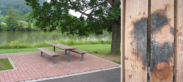 Offenes Feuer auf neuem Holztisch (Fotos:Polizei)(hr) (pol) Der erst vor wenigen Wochen neu eingerichtete Rastplatz an der Bundesstraße 37 gegenüber den Wasserspielen war in der Nacht von 27. auf 28. Juni das Ziel von Vandalen. Offenbar wurde auf einem Holztisch ein Feuer entzündet, wodurch zwei Holzbohlen stark beschädigt wurden.