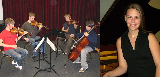 Streichquartett und junge Pianistin spielen klassische Werke Das Streichquartett der Musikschule Eberbach und Vanessa Lindenmaier aus Buchen musizieren. (Fotos:privat)(hr) (sno) In Zusammenarbeit mit der Musikschule Eberbach und der Joseph-Martin-Kraus-Musikschule Buchen präsentiert die Sparkasse Neckartal-Odenwald zum dritten Mal ein Konzert mit hoffnungsvollen Nachwuchskünstlern aus der Region. Das "Talent-Forum" findet am Dienstag, 11. Juli, um 19.30 Uhr in der Sparkassen-Hauptstelle Eberbach statt. Den Konzertabend gestalten abwechselnd das Streichquartett der Musikschule Eberbach in der Besetzung Frederik Schmidt (Violine), Alexander Schindler (Violine), Gesa Stupperich (Viola), Konrad Heimpel (Cello) und die junge Pianistin Vanessa Lindenmaier von der Musikschule Buchen. Bemerkenswert ist, dass Lindenmaier beim gerade zu Ende gegangenen Bundeswettbewerb "Jugend musiziert" in Freiburg mit ihrer Partnerin Angelina Jungblut (Sopran) in der Wertung Kunstlied (Gesang und Klavier) mit 24 Punkten einen 1. Preis erzielte.