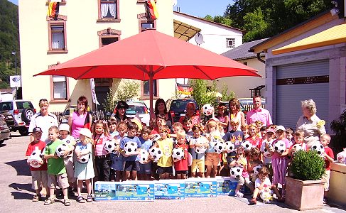 Markisen Bauer denkt bereits an Ballzauberer von morgen Sven Bauer mit den Kindergartenkindern und Erzieherinnen auf dem Firmengelände im Neuen Weg. (Foto:A.Claussen)(jc) Während sich ganz Deutschland auf das WM-Halbfinale Deutschland gegen Italien vorbereitet, blickt die Eberbacher Firma Markisen Bauer schon weiter in die Zukunft. Damit die kleinen Ballack’s und Poldi’s auch für zukünftige Elfmeterschiessen gewappnet sind, spendete Firmeninhaber Sven Bauer am Vortag des großen Matches fünf Torwände und jede Menge Fußbälle an alle Eberbacher Kindergärten.