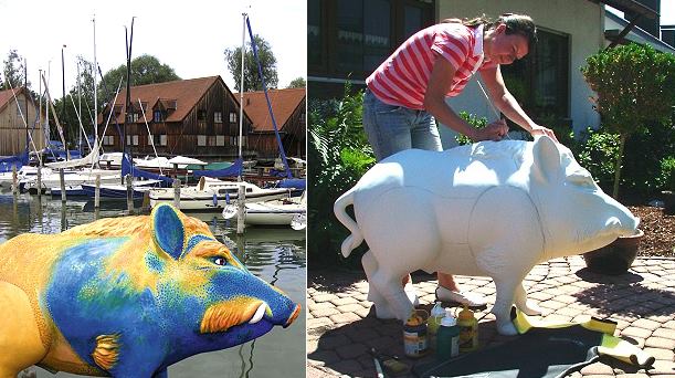 Eberbacher Eber kommen weit herum Der Eber "Eueu" von Manfred Garstka am Landungssteg in Utting am Ammersee. Rechts Grafikerin Linda Rumbach bei den Arbeiten am "Channel-Eber". (Fotos:Grove/Richter)