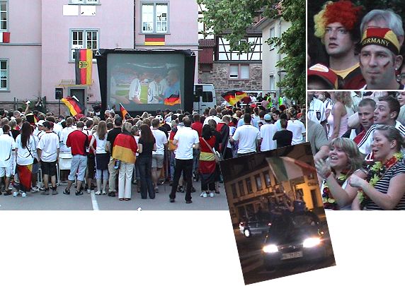 Enttäuschung auch bei Eberbacher Fans - Jubel bei den Italienern (Fotos:Richter)(hr) Kurz vor Schluss der Fußball-WM hatte nun auch Eberbach nach langem Genehmigungsverfahren sein erstes "Public Viewing"-Event. Gut 500 Fußball-Fans dürften es gewesen sein, die gestern Abend im Hof der Dr.-Weiß-Schule das Halbfinal-Spiel Deutschland - Italien verfolgten. Der eingesetzte Hochleistungs-Beamer brachte ein ansehnliches TV-Bild auf die vier Meter breite Leinwand. Das war am Anfang wegen des Tageslichtes zwar noch etwas blass, kam in der zweiten Halbzeit dann aber brillant rüber und vermittelte zusammen mit der kräftigen Tonanlage einen Hauch von Stadion-Atmosphäre. Das überwiegend junge Publikum schwang Deutschland-Fahnen, spendete Szenenapplaus und stimmte Fan-Gesänge an. Nur zum Jubeln kamen die Fans nicht so recht, weil der erhoffte Einzug des deutschen Teams ins Endspiel nach packenden 90 Minuten und 30 Minuten Verlängerung an den beiden Toren Italiens kurz vor dem Abpfiff scheiterte.