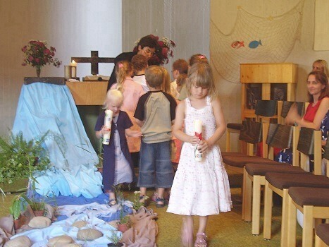 Dekanin Schneider-Cimbal erklärte den Kindern die Taufe als Quelle des christlichen Lebens und taufte den kleinen Benjamin. Im Anschluss an die Taufe erarbeitete sie dann mit den Kindern und den Erwachsenen, wie das Wasser der Taufe, symbolisiert durch den Fluss, uns durchs Leben begleitet. Die Steine auf dem Weg wie auch das, was zum blühen kommt, wurden gemeinsam erarbeitet und durch jeweils eine Flaschenpost vom lieben Gott kommentiert. Der Fisch als Symbol für "Freund Jesus den Sohn Gottes und Christus" (= Retter) wurde gedeutet und jedes Kind bekam einen Fischanhänger zur Erinnerung an den Gottesdienst mit auf den Weg. Mit seinen vielen fröhlichen Liedern, der plastischen Gestaltung des Wassers, das aus der Taufe fließt und dem Predigtgespräch war es ein ganz besonderer Gottesdienst für alle Besucherinnen und Besucher.