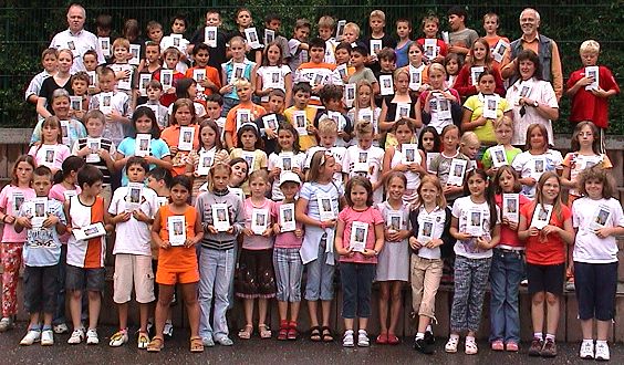 Eberbachs Altstadt wird zum Unterrichtsobjekt Heute bekamen die Drittklässler der Steige-Grundschule ihre Altstadt-Führer überreicht. Links oben Schulleiter Norbert Hofstetter, rechts oben Günter Lipski vom Bürger- und Heimatverein. (Foto:C.Richter)(cr) Auf dem baden-württembergischem Bldungsplan für die 3. Klassen der Grundschule steht unter anderem das Unterrichtsfach "Mensch, Natur und Kultur" (MeNuK). Dass dieses Fach nicht nur aus trockenem Lehrstoff bestehen muss, beweisen die Eberbacher Dr.-Weiß- und die Steige-Grundschule. Alle Schülerinnen und Schüler dieser Schulen zogen zusammen mit ihren Lehrern los, um Eberbach zu erkunden. Stadtführungen, Museen, die Eberbacher Burg, das Felsennest und der höchste Baum Deutschlands waren in der Vergangenheit Ziele der Drittklässler. Damit die Kids aber auch alles Interessante und Wissenswerte über ihre Stadt nachlesen können, unterstützt der Bürger- und Heimatverein Eberbach das heimatkundliche Unterrichtsprojekt. Günter Lipski, 1. Vorsitzender des Bürger- und Heimatvereins, überreichte allen Schülerinnen und Schülern sowie ihren Lehrern das Büchlein "Auf altem Pflaster - ein Spaziergang durch die Altstadt von Eberbach" von Dr. Roland Vetter. Die Broschüren haben einen Verkaufswert von insgesamt rund 540 Euro. Die Aktion soll auch in den kommenden Jahren durchgeführt werden.