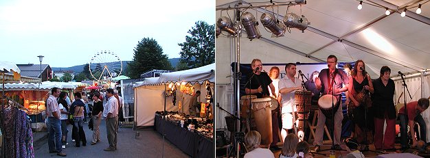 106. Beerfelder Pferde-, Fohlen und Zuchtviehmarkt eröffnet Nur langsam füllte sich heute das Festgelände. Auch die Percussionisten "Bingoma" hatten im Kleinkunstzelt zunächst nur wenige Zuhörer. (Fotos:Claussen)(jc) Traditionell am zweiten Wochenende im Juli findet in Beerfelden der Pferde-, Fohlen-, und Zuchtviehmarkt statt. Mit dem Start des Reit- und Springturniers begann heute um 10 Uhr die 106. Auflage des Volksfestes am Quellort der Mümling. Auch in diesem Jahr setzten die Veranstalter wieder auf eine Kombination von Fahr- und Verkaufsgeschäften, Reit- und Springturnier, einem kulturellem Rahmen, wie dem Kleinkunstzelt, sowie dem Viehmarkt am Montag. Bereits zum 26. Mal laden Einzelhändler und Handwerker zu einer Gewerbeschau.