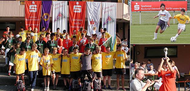 Eberbachs Beitrag zur WM endet mit Sieg der Ukraine über Polen Bei der Siegerehrung sowie Spielszene "Deutschland" gegen "Ecuador" (Fotos:Claussen)(jc) Eberbachs Beitrag zum WM Sommer 2006, ursprünglich als Ersatzveranstaltung für Großbildübertragungen gedacht, ging heute im Stadion in der Au über die Bühne. Dabei wurde nach dem original Spielplan der Fifa-WM ein Turnier mit 32 Jugendmannschaften ausgetragen (wir berichteten bereits mehrfach). Obwohl der Turnierverlauf sonst reibungslos von statten ging, gab es doch gleich zu Beginn ein echtes "Skandalspiel" . Im Vorrundenspiel "England" gegen "Paraguay" hatte sich ein Spieler "eingeschlichen", der Älter war, als es die Ausschreibungsrichtlinien zuließen. So wurde der 5:1-Sieg der "Engländer" in ein 0:3 umgewandelt und der Spieler ausgeschlossen. In der Folge blieben die "Engländer" weiter sieglos und überstanden die Vorrunde nicht. Besser ging es "Deutschland", das als Tabellenzweiter, wie bei der Fifa-WM im Achtelfinale auf "Schweden" traf. Allerdings war, im Gegensatz zu den "Klinsmännern", hier nach 0:3-Schlappe Endstation für das Team aus Buchen. Die "Schweden" aus Eberbach unterlagen dann erst im kleinen Finale "Saudi Arabien" (Sinsheim) mit 0:3. Im Finale unterlag "Polen" (Eberbach) der "Ukraine" mit 1:4. Bei der Siegerehrung durch Bürgermeister Bernhard Martin gab es von den Sponsoren gestiftete Preise. Für den Sieger natürlich den Pokal, dazu für alle Spieler den "Teamgeist"-WM-Ball und eine Fahrt zu einem Bundesliga-Spiel in Stuttgart, wo dann nach dem gestrigen emotionalen WM-Ausklang für das DFB-Team im Gottlieb-Daimler-Stadion noch einmal Erinnerungen an die WM aufkommen werden. Für die Zweitplatzierten geht es mit WM-Bällen zu einer Zweitliga-Partie nach Karlsruhe. Platz drei war mit einer Sporttasche mit WM-Bällen und Brieftaschen dotiert. Das Team auf dem „undankbaren“ vierten Rang musste zwar ohne Medaille auskommen kann jetzt aber mit neuen Bällen und Sportrucksäcken aufwarten.