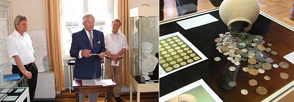 Vom Denarivs zum Euro – Ausstellung im Museum eröffnet Albrecht Germann (m.), aus dessen Besitz ein Großteil der Münzen stammt, führte bei der Eröffnung in die Austellung ein. Grußworte kamen vom Stellvertreter des Bürgermeisters Günter Wiedemer (l.) und vom 1. Vorsitzenden des Museumsvereins, Dr. Klaus Eichner (r.). (Fotos:Claussen)(jc) Wer der Meinung ist mit der Einführung des Euro habe Europa im Jahr 2002 erstmals eine einheitliche Währung erhalten der irrt. Denn bereits vor über 2000 Jahren waren römische Münzen mit dem Bild des Kaisers auf der Vorderseite in weiten Teilen Europas gültiges und akzeptiertes Zahlungsmittel. Die wichtigste römische Silbermünze war der Denarivs. Sie war seit ihrer Einführung um 211.v.Chr. für etwa 400 Jahre die Leitmünze. Diesem Zeitraum hat sich eine Münz-Sonderausstellung unter dem Titel "Der Euro der Römer – Eine Währung für Europa" verschrieben, die seit dem vergangenen Freitag im Museum der Stadt Eberbach zu bestaunen ist. Über 100 Münzen sind ausgestellt und können zu den Museumsöffnungszeiten Dienstags und Freitags 15-17 Uhr sowie Samstags und Sonntags von 14-17 Uhr in Augenschein genommen werden. Flankiert wird die Ausstellung von drei Vortragen im Herbst, die sich unter anderem mit dem Thema "Münzfälschungen" beschäftigen.