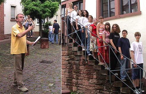 HSG-Theater-AG spielt Krimi in der Altstadt Eberhard Höhn gibt Regieanweisungen. Rechts das Ensemble auf der Badhaus-Treppe. (Fotos:C.Richter)(cr) Die Altstadt Eberbachs wird erstmalig Schauplatz für ein Stationen-Theater sein. Ab Dienstag, 18. Juli, bis Freitag, 21. Juli, wird jeweils abends an verschiedenen Stellen in der Innenstadt ein Kriminalstück aufgeführt. "Heidens Abschied oder die Besten sterben zuerst" heißt die Mord-Geschichte, die Eberhard Höhn und Jutta Gewahl, beide Lehrer am Gymnasium, speziell für die T.O.N. Theater-AG des Hohenstaufengymnasiums geschrieben haben. Für die passende musikalische Begleitung wird die Big Band des HSG sorgen. Neu ist bei diesen Veranstaltungen, dass die jungen Schauspieler an verschiedenen Stellen spielen werden: Im Pulverturm beginnt der Krimi, weiter geht es zum Kornmarkt, auf die Treppe hinter dem Badhaus, in den Innenhof des Haspelturms und zurück zum Pulverturm, wo die Zuschauer auf die Klärung der Morde hoffen dürfen.