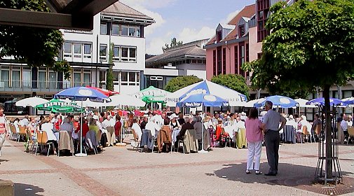 Bürgerstiftung lädt zum Essen für einen guten Zweck Am 23. Juli werden die Tische auf dem Leopoldsplatz wieder wie im vergangenen Jahr für ein Benefiz-Essen gedeckt. (Foto:Richter)(hr) Zum zweiten Mal lädt die Bürgerstiftung Eberbach am Sonntag, 23. Juli, zur "Bürgertafel" auf dem Leopoldsplatz ein. Ab 12 Uhr kann man sich dort an die gedeckten Tische setzen und sich mit einem "Odenwälder Schlemmer-Menü" verwöhnen lassen, das die Chef-Köche der Restaurants Café am Leopoldsplatz, Kühler Krug und Krone-Post kredenzen werden.