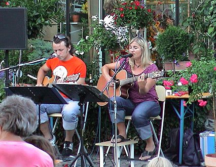 Rosige Zeiten im Bergweg Susanne Lutz und Oliver Barth unterhielten mit Rockballaden und Popsongs. (Foto:C.Richter)(cr) Zu einem besonderen "Rosen"-Event lud heute erstmalig die Gärtnerei Brenneis im Bergweg in Eberbach ein. Zwischen leuchtenden Rosen namens Amanda, Anna, Metallina oder der wohlriechenden Augusta Luise fand am Nachmittag eine Lesung von Erika Hils statt. In fast märchenhafter Idylle inmitten bunten Blumen und vielfältigen Düften las sie aus dem Buch "Röslein rot" von Ingrid Noll. Am Abend sorgte das Duo Soulli (Susanne Lutz und Oliver Barth) mit Gitarre und Gesang unplugged mit Rockballaden und Popsongs für Unterhaltung. Für Beratung und Tipps rund um die Königin der Blumen standen Ralph Brenneis und sein Team den Gästen zur Verfügung, ebenso war Literatur passend zur Rose erhältlich.
