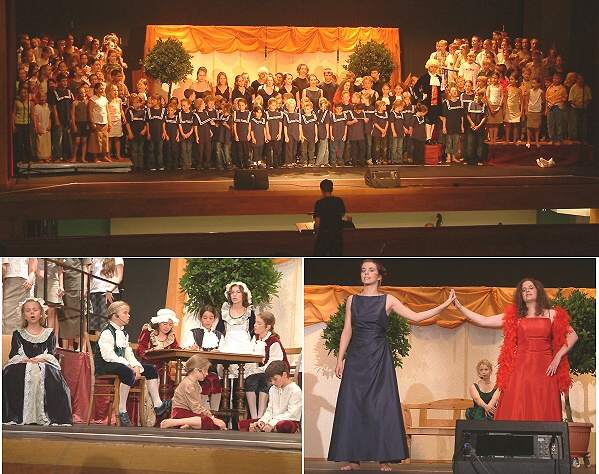 Kindermusical geriet zum Happening Alle Chöre gemeinsam auf der Bühne bei der Premiere am Freitagabend. (Unten links) Blick in die Wohnstube der Familie Bach. Die "Unirdischen", die Tugend (Luisa Menges) mit ihrer Gegenspielerin Malvitia (Charlotte Hamway) die das Laster verkörpert und im Hintergrund die Kunst (Nicola Dausch) als unsichtbare aber wort- und stimmgewaltige Szenenbegleiterinnen. (Fotos:Wörner)(tw) Eine Woge der Begeisterung schwappte förmlich von den Akteuren auf das Publikum über, bei der Premiere des Kindermusicals "Krach bei Bach" am Freitagabend. Nicht minder bravourös aber vielleicht etwas gelöster meisterte das Ensemble die Aufführungen am Samstag und Sonntag vor einer jeweils gut gefüllten Stadthalle.