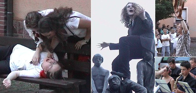 Rätselhafte Morde in Eberbachs Innenstadt Eine Leiche auf der Parkbank am Kornmarkt und ein durchgeknallter Chorleiter geben dem Publikum Rätsel auf. (Fotos:C.Richter)(cr) Mitten in Eberbach passieren seit Dienstag eigenartige Dinge. Menschen laufen aufgeregt durch die Innenstadt, selbst Morde geschehen. Der Grund für diesen Umtrieb ist die Aufführung des Kriminalstücks "Heidens Abschied oder die Besten sterben zuerst". Eberhard Höhn und Jutta Gewahl, beide Lehrer am Hohenstaufen-Gymnasium (HSG), schrieben gemeinsam dieses Stück, das noch bis Freitag an verschiedenen Schauplätzen in der Altstadt von der T.O.N.-Theater AG des HSG aufgeführt wird.
