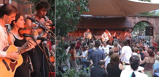 Eigener Sound jenseits des Irish Folk (Fotos:Richter)(hr) Mit irischen und keltischen Klängen begeisterte die südhessische Band "Dhalia´s Lane" am vergangenen Freitag, 14. Juli, auf Einladung des Kulturlabors ihre Zuschauer im Innenhof am Pulverturm. Flotte Tänze und sanfte Balladen wechselten sich ab, und mitunter mischten sich auch ein mittelalterlicher Touch und ein Hauch von Orient in die vielschichtige Musik des Quartetts, das in Eberbach durch die beiden Gastsängerinnen Anna Hachulla und Diana Hübner verstärkt wurde. Die Musiker spielten früher in illustren Bands wie "Paddy Goes To Holyhead" oder "Wild Silk" und kreierten einen eigenen Sound, der sich von dem üblichen Irish Folk abhebt.