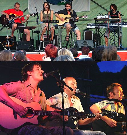Freibad-Feierlichkeiten mit großem Zuspruch angelaufen (Fotos:C.Richter)(hr) Mit einem Spielenachmittag begannen gestern die Feierlichkeiten zum 70-jährigen Bestehen des Eberbacher Freibads. Am Abend genossen dann knapp 500 Besucher bei bester Stimmung akustische Live-Musik der Eberbacher Band "Heart of the Rainbow" (Bild oben) und anschließend einen furiosen Querschnitt durch 40 Jahre Popgeschichte mit den drei Sängern und Gitarristen von "Cool Breeze" (Bild unten). Das Kulturlabor hatte mit dem großen Ansturm nicht gerechnet und geriet zwischenzeitlich in Versorgungsengpässe bei den gekühlten Getränken. Das tat der guten Stimmung aber ebenso wenig Abbruch wie ein kräftiger Regenguss am späten Abend. Die nassen Tische und Stühle wurden zur Seite geschoben, und man feierte im Stehen vor der Open-Air-Bühne weiter bis nach Mitternacht.