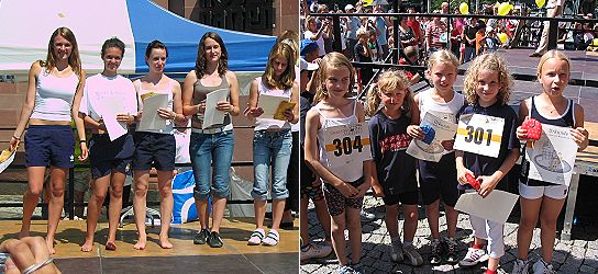 Erfolg für die weibliche B-Jugend am Mannheimer Wasserturm Links: Jana Mertes, Madeleine Held, Giulia Nohe, Sina Schlick und Helen Schmidt (v.l.) bei der Siegerehrung der weiblichen B-Jugend, rechts: Mona Selzer, Nina Häffner, Luisa Hentsch, Anna-Lena Grassmann und Jenny Hiller (v.l.) nach der Siegerehrung. (Fotos: privat)(bro) (td) Nach vier vom vergangenen Jahr traten diesmal gar fünf Staffeln mit je fünf Läuferinnen und sechs Bambini-LäuferInnen der Leichtathleten des TV Eberbach bei der alljährlichen Großveranstaltung "Sport und Spiel am Wasserturm" an. Bei starkem Sonnenschein und teilweise drückender Hitze waren neben den Laufwettbewerben zahlreiche Attraktionen wie Stepp-Gruppen, Tanzkampfakrobatik, Hip-Hop-Dance, Fechten, Radrennen und vieles mehr zu bestaunen. Bei den Staffelwettbewerben "Rund um den Wasserturm" gab es harte Konkurrenz der Mannheimer Leichtathletik-Großvereine, die das Siegen für die "Auswärtigen" schwer machte. Trotzdem gab es gute Leistungen und Plätze für die Eberbacher.