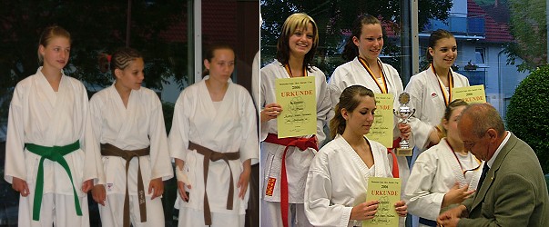 Landesmeisterschaft der Mannschaften in Baden-Württemberg Links: 3. Platz für das Team KG Odenwald Schüler Mädchen (Aylin Steinbauer re.), rechts: 3. Platz für das Team KG Odenwald Jugend Mädchen: Christiane Gode (Maulbronn), Nina Weidmann (Eberbach) und Wallery Dankert (Heidelberg) (v.l.). (Fotos: privat)(bro) (pst) Der Team-Cup bildet für den Karatesport in Baden-Württemberg das High-Light jeder Saison. Besonders der Modus, bei dem die Teams in den einzelnen Altersklassen zuerst in Gruppen jeder gegen jeden antreten und dann die jeweils beiden Gruppenersten im K.O.-System den Sieger ermitteln, verlangt den Startern alles ab. Nicht selten müssen die Teams sechs, sieben oder mehr Kämpfe hintereinander bestreiten. Während es bei den Kindern und Schülern nur um den Landesmeistertitel ging, diente der Vergleich bei den Jugendlichen auch als Qualifikation zu den Deutschen Meisterschaften.