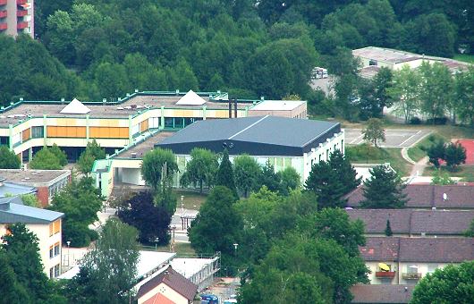 Dachsanierung an der Ittertal-Halle geht weiter (Foto:Richter)(hr) Nachdem im vergangenen Winter ein Satteldach auf das undichte Flachdach der Ittertal-Sporthalle aufgesetzt worden war, zeigen sich nun weitere Undichtigkeiten in den verbliebenen Flachdachbereichen am Halleneingang / Tribüne (Bildmitte links) und auf dem Geräteraumtrakt unterhalb der Sporthalle.