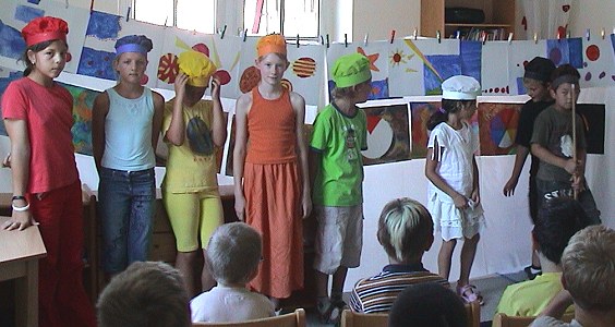 Alle Farben sind gleich schön und gleich wichtig (Foto:C.Richter)(cr) Sprichwörtlich farbenfroh präsentierten sich heute Kinder des Schülerhorts in der Weidenstraße. Zusammen mit Heidi Stumpf, Leiterin des Schülerhorts, hatten die Schüler bereits seit einem halben Jahr ein Theaterstück rund um das Thema Farben einstudiert.